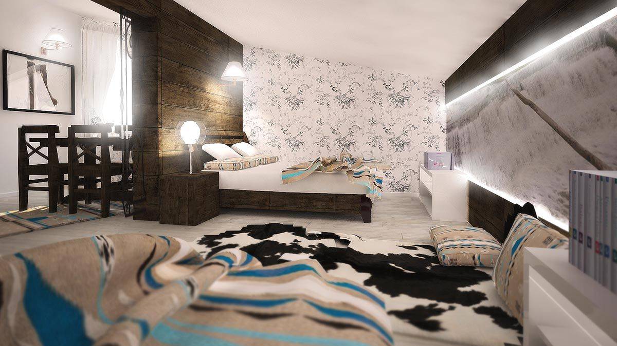 Полированное дерево – такая же яркая примета нового, как скругленные углы, терракотовая гамма, темные стены и безумная живописность в локальной отделке стен спальни 13 кв м.