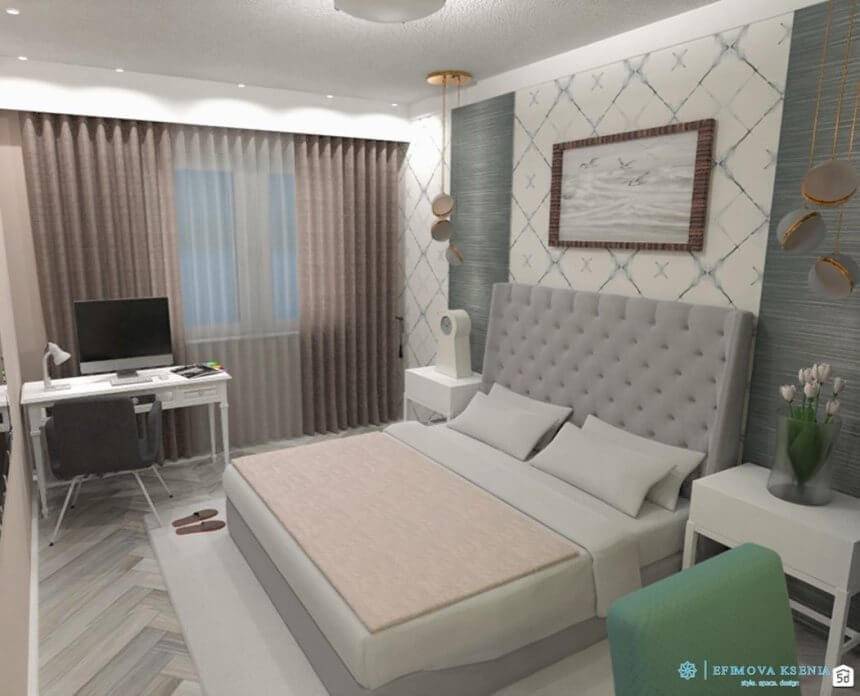 Ограничений на использование отделочных материалов в дизайне спальни 15 кв практически нет — здесь не бывает повышенной влажности или температуры. Выбирайте качественные покрытия, которые не выделяют вредных веществ и прослужат долгие годы.