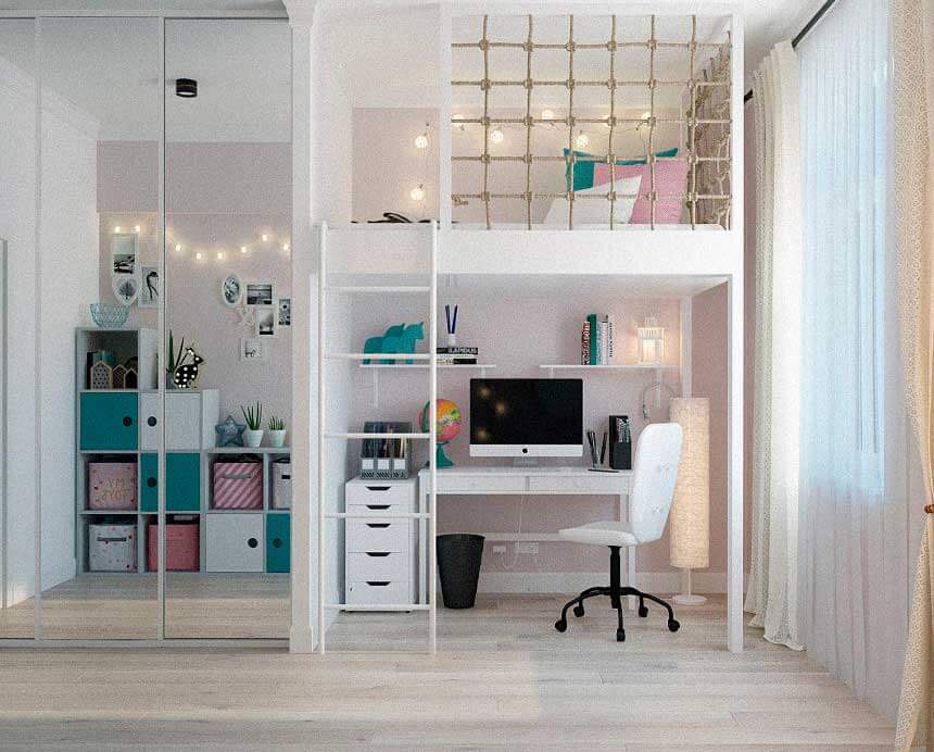 В квадратной комнате практичнее использовать многофункциональную мебель. Современный угловой диван можно разложить на ночь, превратив его в удобное спальное место. Кровать-чердак с рабочим уголком на нижнем ярусе подойдет для комнат с высокими потолками.