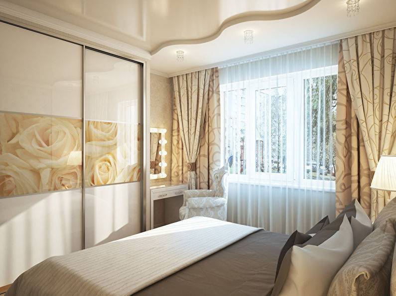 Маленькие спальни чаще всего имеют небольшую высоту потолка, поэтому лучше отказаться от многоярусных конструкций. Окрашивание, обои или подвесные потолки – лучшее решение для малогабаритных квартир. Лучше всего выбирать однотонные светлые покрытия с глянцевым эффектом. Это будет создавать иллюзию высокого потолка.