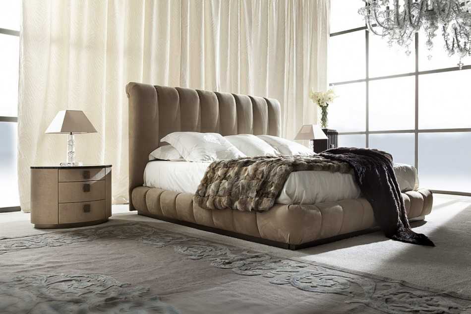 Для создания спокойной, расслабляющей атмосферы используют тёплые тона – песочный, бежевый, шоколадный, серый, молочный. Центром комнаты делают кровать. Следует подобрать модель из массива ореха или вишни и дополнить её двумя тумбами и шкафом.
