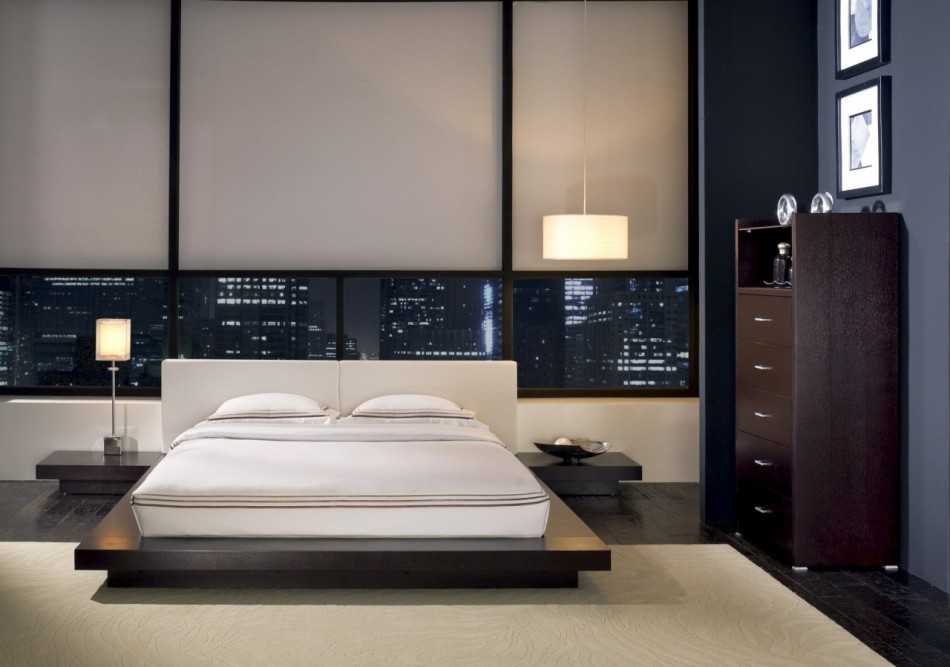 Приступать к реализации современного стиля в пространстве спальни надо с покупки инновационных материалов. Тут разрешены любые виды напольной и стеновой отделки, монтаж любой разновидности потолка. Направление открывает простор для экспериментов. Не возбраняется наличие электроники.