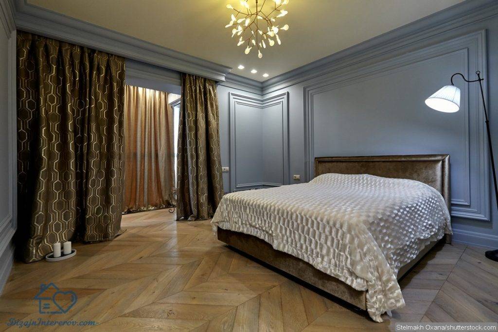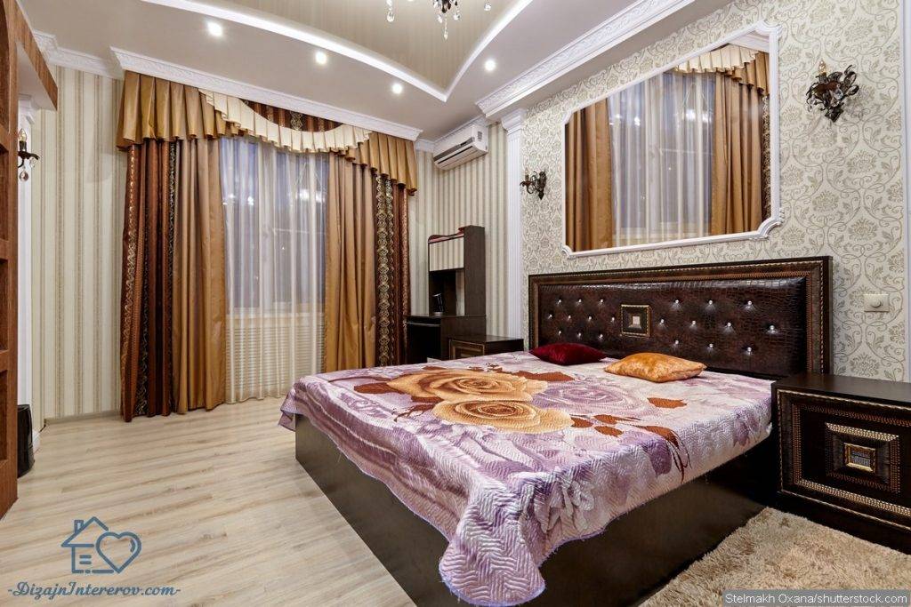 Драпировки подбираются в одном стиле, сочетающиеся друг с другом. Шторы могут контрастировать с обоями или совпадать с ними по тону, если так задумано. Покрывало выбирается такого же цвета, как накидки на креслах. Ковер нужен большой – от каждой из его сторон до стен оставляют всего 15-20 см. – это помогает расширить пространство, объединив все предметы меблировки. Одну из зон можно выделить ковриком меньшего размера.