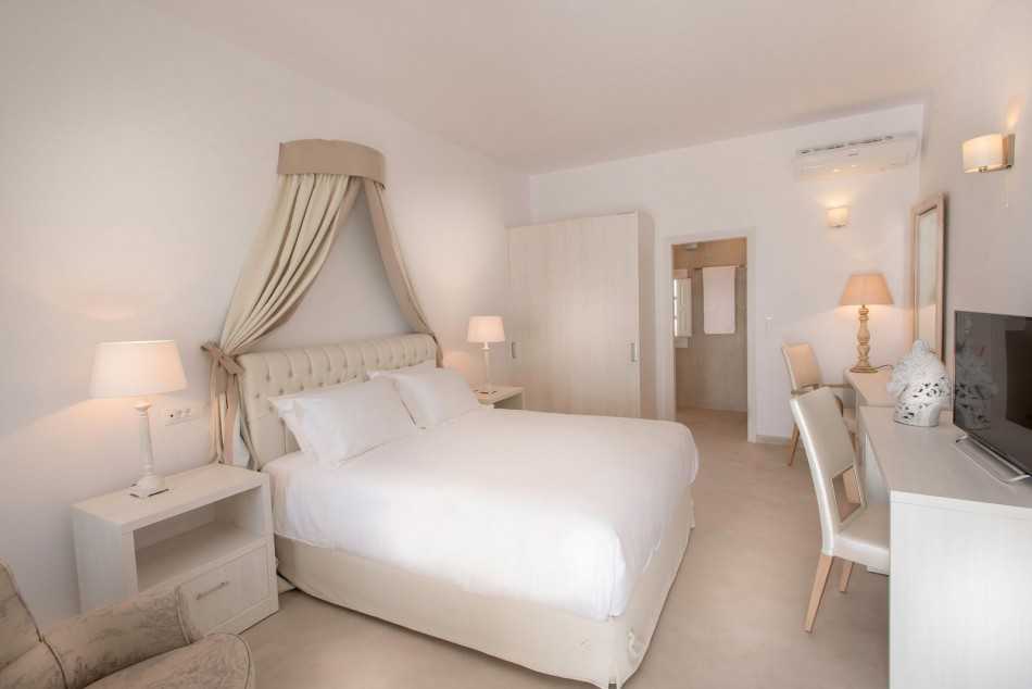 Полностью белая спальня выглядит необычно за счет обилия отражаемого света, для контраста можно использовать вазы с цветами или комнатные растения в горшках