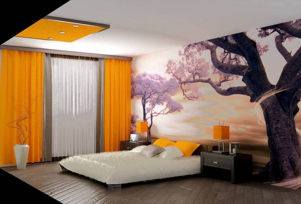 Фотообои в интерьере спальни, фото демонстрирует бумажный отделочный материал