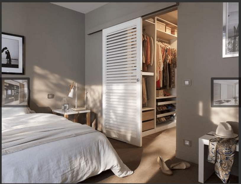 - Спальня с гардеробной, размещенной вдоль глухой стены (линейная планировка). Существует 3 способа установки: ниша, шкаф-купе или встроенный шкаф.