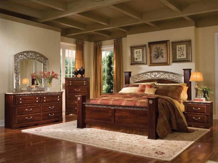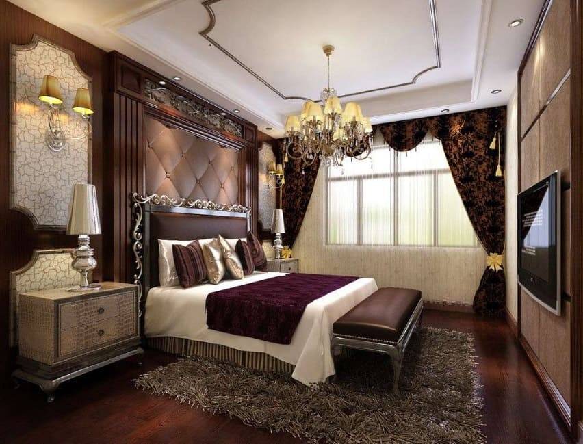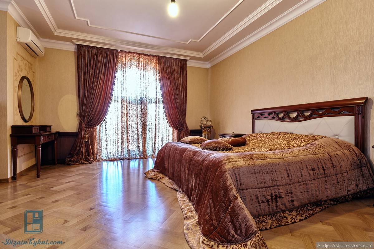 Главным украшением спальни в классическом стиле является дорогостоящая древесина, которая уместна в любом интерьере. Красновато-коричневые и шоколадные поверхности имеют уникальный рисунок, подчеркивая изысканность помещения. Кроме того, коричневый цвет легко сочетается с кремовым, бежевым и другими оттенками. А также беспроигрышно выглядит комбинация темно-коричневой мебели с золотом.