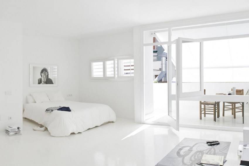 Если нет цели делать чисто белую комнату, основного цвета может о 80% по пропорциональному соотношению. Можно использовать мебель с цветной обивкой, тюль с градиентом (с размытым переходом оттенков), мозаичный пол и витражные стекла на мебели или межкомнатных дверях.