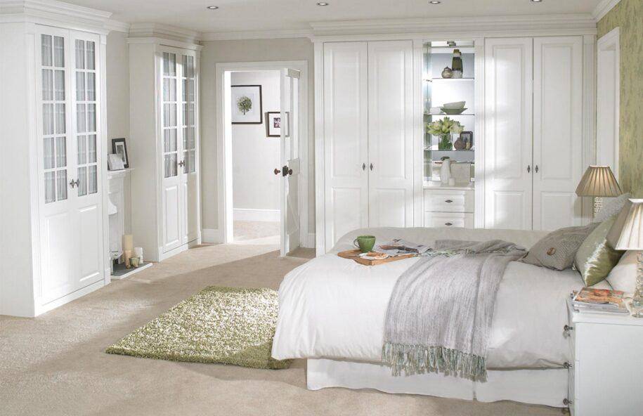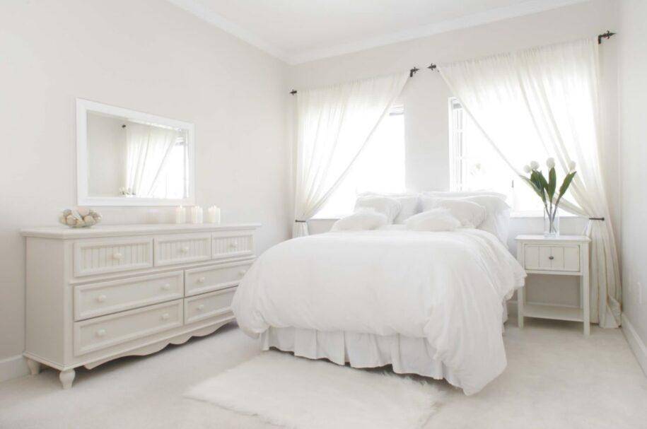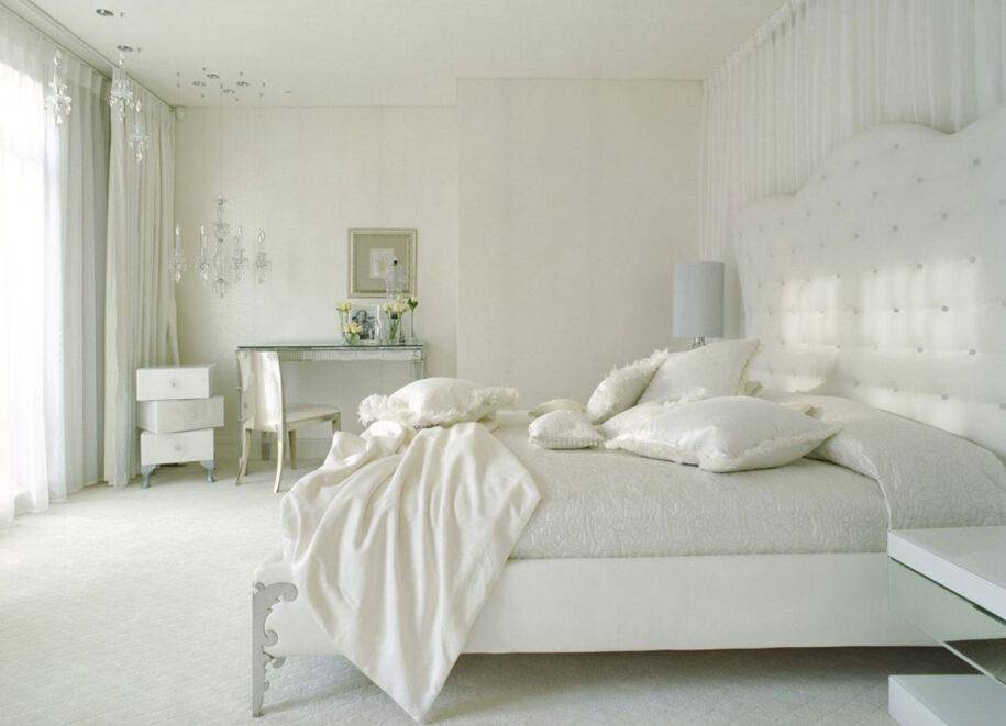 - белая мебель в интерьере спальной комнаты признак богатства, роскоши, в чем можно убедиться, посмотрев фото;