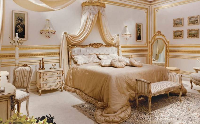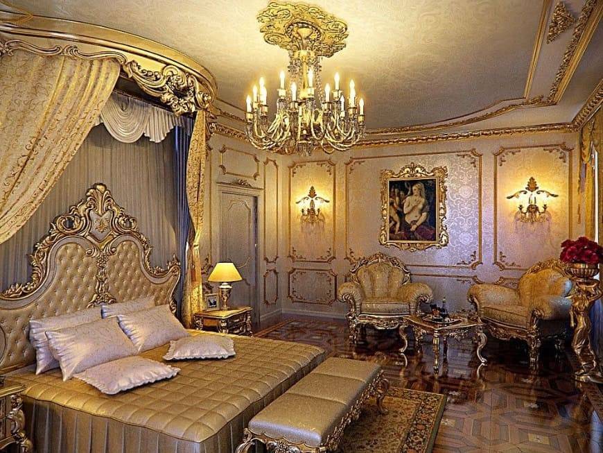 Существуют спальные комнаты полностью выдержанные в золотом цвете. Для создания такого интерьера лучше обратиться за помощью к дизайнерам, иначе велика вероятность получить безвкусный результат.