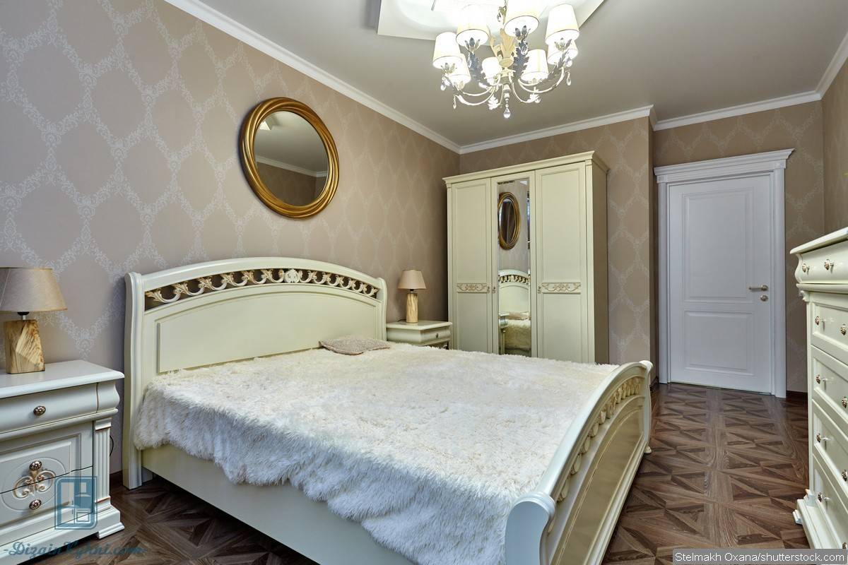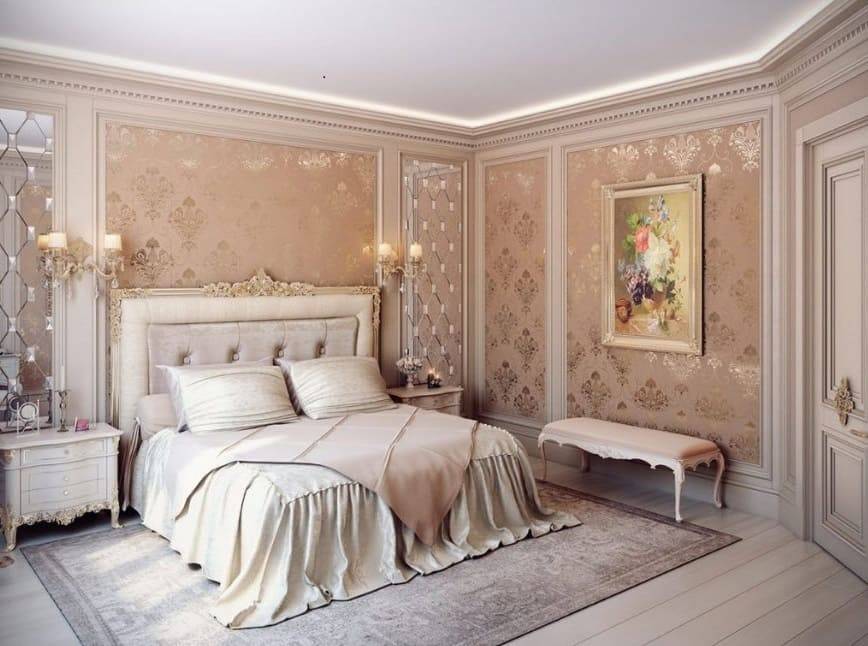 В помещении спальни, оформленной в стиле классики, уместны антикварные вещи: коллекционные статуэтки, старинные зеркала, рамы которых украшают узоры, картины.