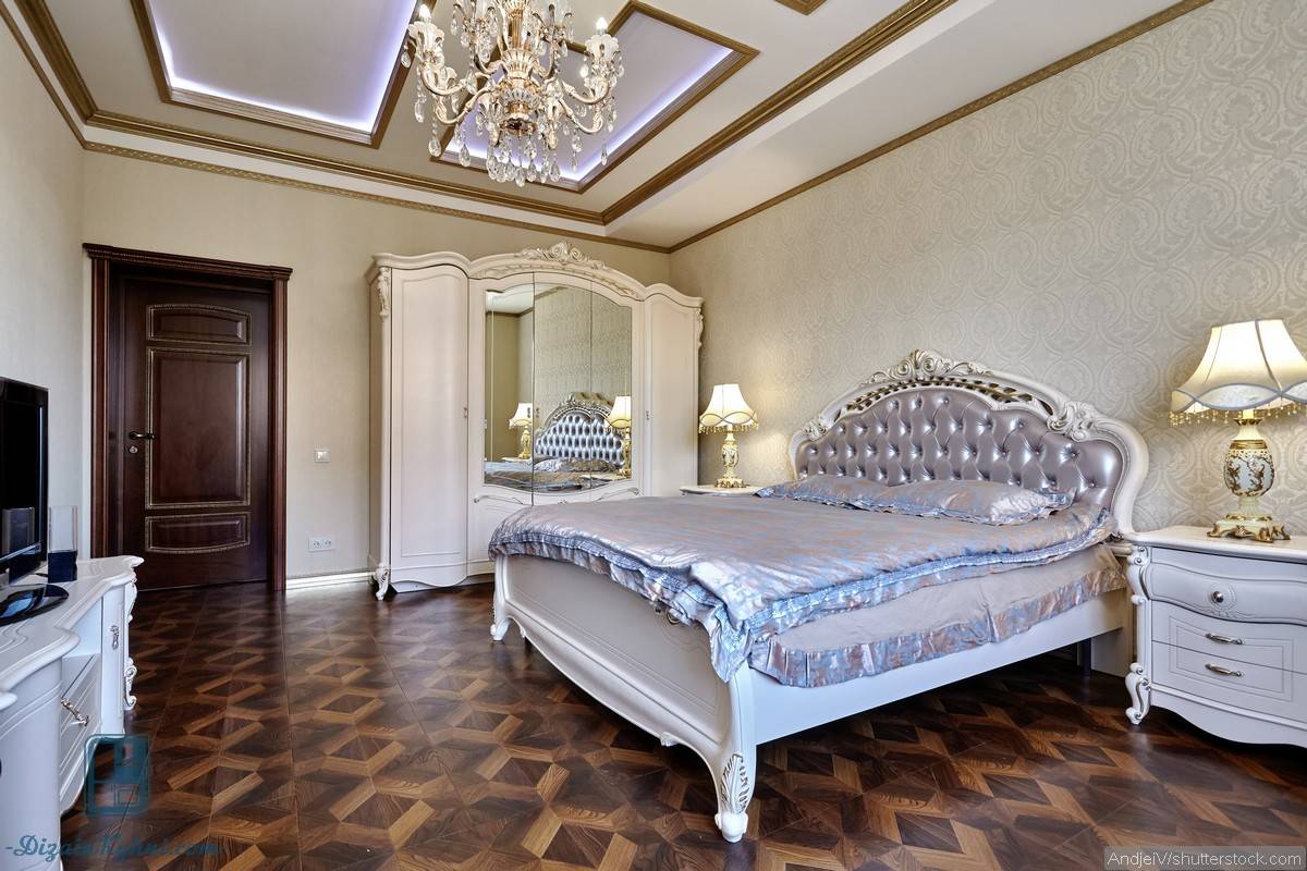 Исключительный вид имеют цвета дорогих древесных пород. Покрытые с помощью лака шоколадные, охристые, ореховые или медно-коричневые колеры с уникальным природным рисунком, добавляют дизайну спальни в классическом стиле невероятной роскоши.