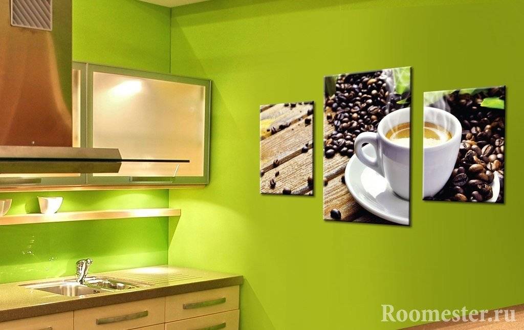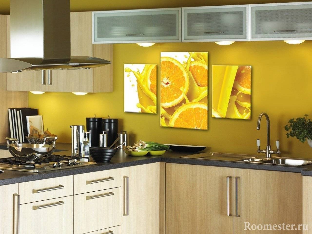 Модульные картины, они же полиптихи, создаются путем разделения изображения на несколько отдельных частей. Появились они сравнительно недавно, но благодаря своей оригинальности и невысокой стоимости быстро стали популярны. Для кухни можно выбрать уже готовую картину или напечатать любой выбранный снимок. Изображение может быть перенесено на холст фотобумагу, дерево, стекло. Также его можно состарить, используя специальный гель-кракелюр.