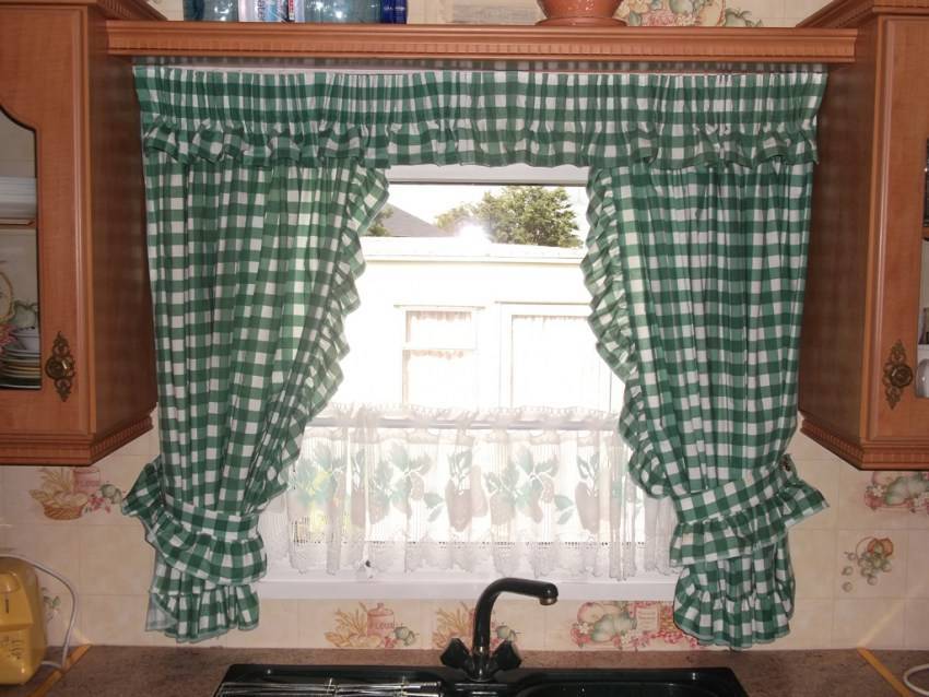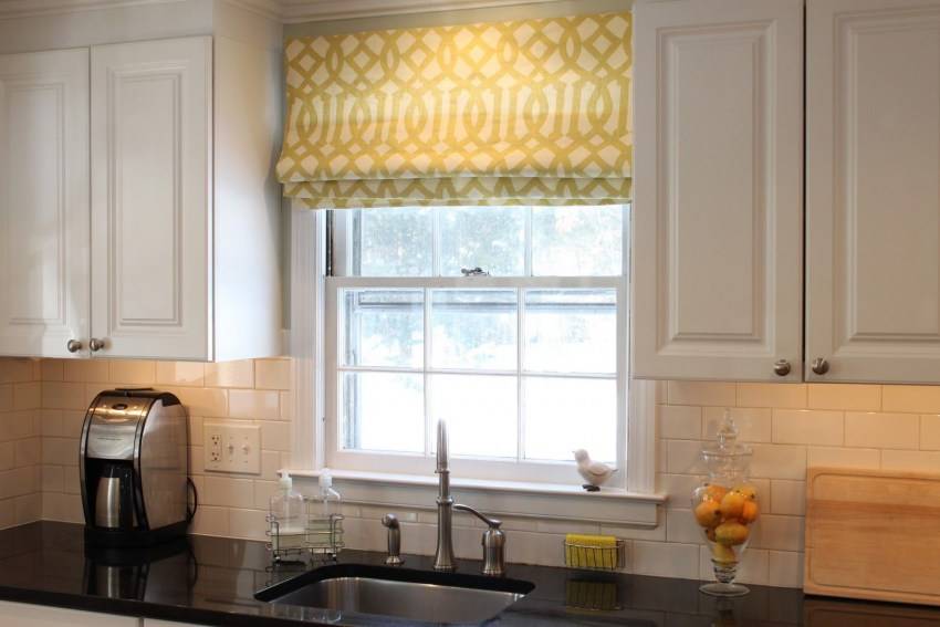 Если газовая или электрическая плита на кухне расположена вплотную к окну, длинную штору повесить невозможно, используют короткие варианты.