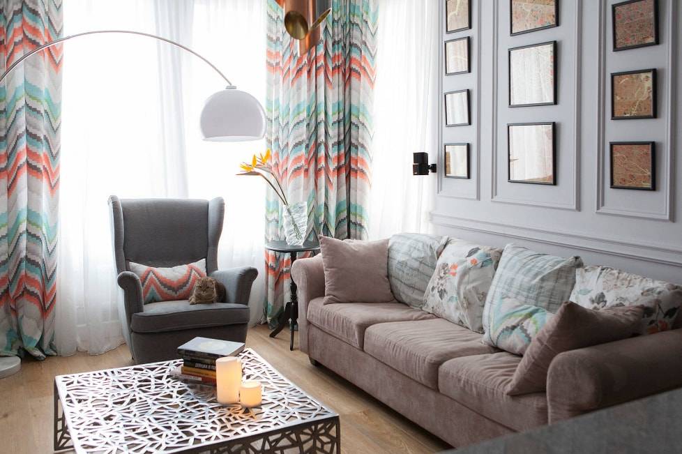 В качестве узора или рисунка выбираем только небольшие этно-принты, никаких квадратов или прямоугольников, нужны только плавные изгибы. Такие шторы отлично подойдут в небольшие комнаты, где необходимо визуально увеличить свободное пространство.