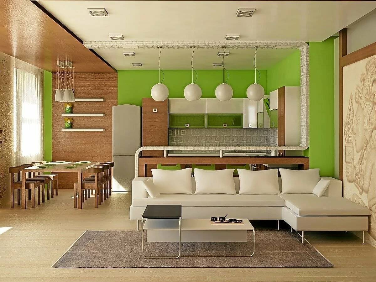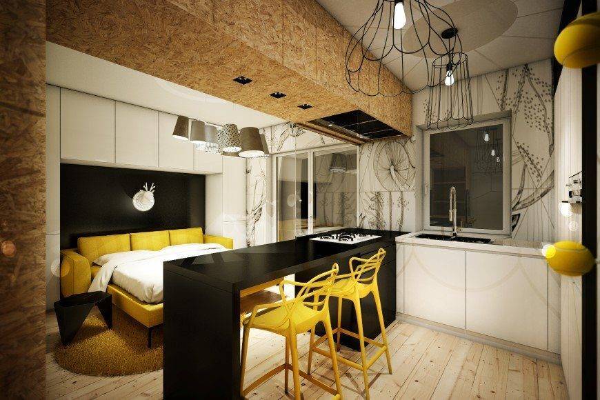 Место, где готовят пищу не только может, но и должно быть выделено. Минимизировать распространение запахов поможет вытяжка. Можно выделить зону раздвижной стеной, стеклянной перегородкой или защитить аркой, которая будет частично препятствовать движению воздуха из кухни. Рекомендуется располагать эту часть комнаты возле окна, чтобы проветривать при необходимости.