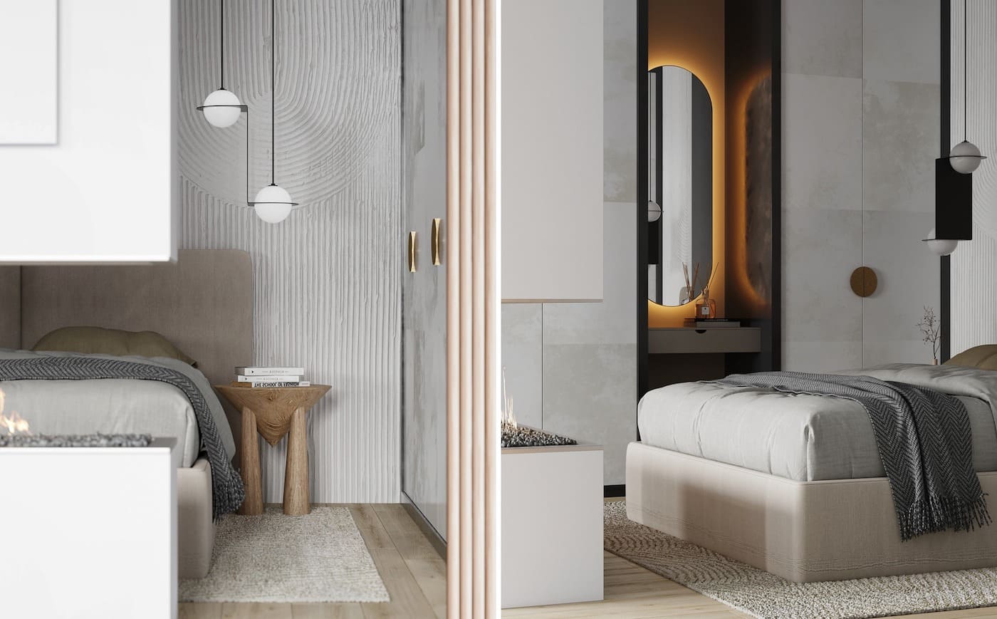 Место для работы можно расположить рядом с кроватью, вмонтировав стол в шкаф-купе. Такой вариант оформления комнаты ограждает жильцов от техники во время сна. Такой дизайн точно оценят любители фэн-шуя.