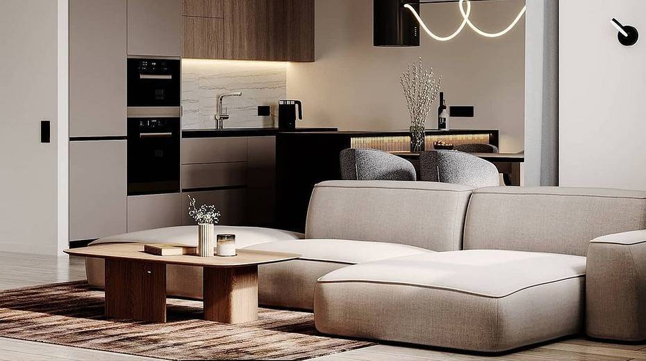 - Помещения без лоджий и балконов чаще всего делятся на две зоны: кухня и зона отдыха. Если у вас есть дополнительное пространство, то его можно присоединить к основному, либо сделать полноценный кабинет.
