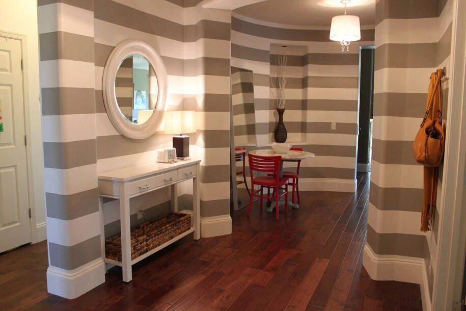 Ровные стены прихожей окрашиваются краской, предназначенной для влажной уборки, чтобы без труда привести их в порядок в случае загрязнения.