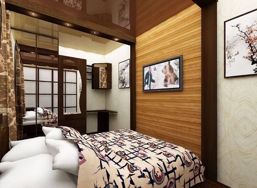 Дизайн узкой спальни японского стиля создаст благоприятную атмосферу, спокойную для отдыха после рабочего дня. Строгие, четкие прямоугольные формы, дополненные спокойными тонами интерьера, идеально впишутся в планировку хрущевки или панельного дома. Наличие растений приветствуется.