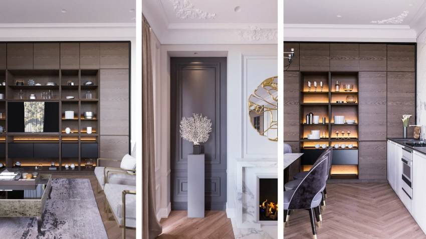 Стоит также отказаться от грубой тяжёлой мягкой мебели, то есть следует выбирать лёгкие конструкции без лишних принтов. Максимум зеркальных поверхностей, декоративная стеклянная, либо деревянная перегородка — самое актуальное решение интерьера в 2020 году. В моду входит зонирование отдельно функционирующего пространства, причём рекомендуется лучше применять декоративные панели.