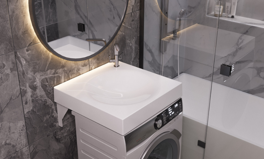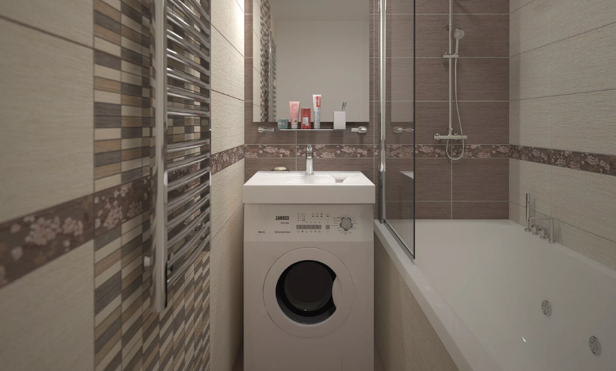 Отдельно скажем о стиральной машине: в санузле 5 кв не устанавливайте ее самостоятельно, используйте пространство над ней как столешницу. Или встройте технику в шкаф. Если вам нужно разместить сушильную и стиральную машину, ставьте их друг на друга.