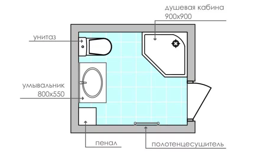 Важно! Минимальные габариты квадратной или прямоугольной душевой кабины — 85 см (комфортная ~100 см), столько же нужно оставить места перед ее дверью. Не пытайтесь сэкономить место, иначе пользоваться душем будет неудобно