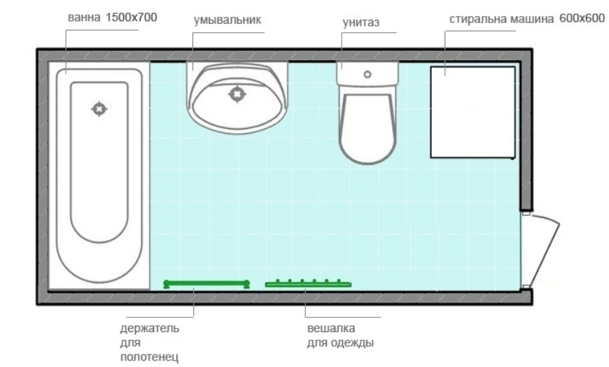 - если помещение вытянутое, то ванну или душевую кабину устанавливают дальше от входа, а ближе к дверному проему располагают унитаз и умывальник.