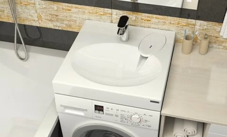- На шкаф под раковину кладут длинную столешницу, под которую удобно спрятать стиральную машинку.