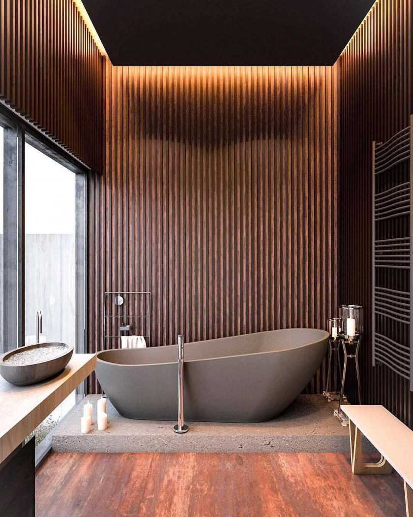 - Керамическая плитка. Для облицовки маленькой ванной выбирайте не слишком крупную (кафель, мозаику). Исключение — однотонный керамогранит: если создать эффект бесшовной поверхности за счет затирки в цвет, можно использовать и плиты 60*60 см. В современном ремонте часто используют имитацию под мрамор, дерево, бетон — такой рисунок выглядит дорого, создает ощущение эксклюзивной отделки.