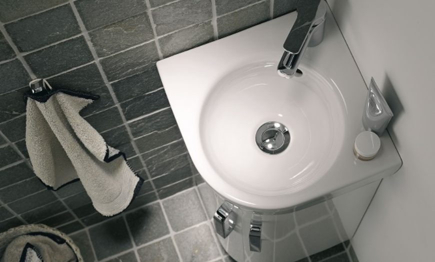 Вся сантехника должна быть выдержана в едином стиле и цветовой гамме. Для маленьких помещений лучше использовать угловые раковины и ванны, поскольку они позволяют освободить пространство.