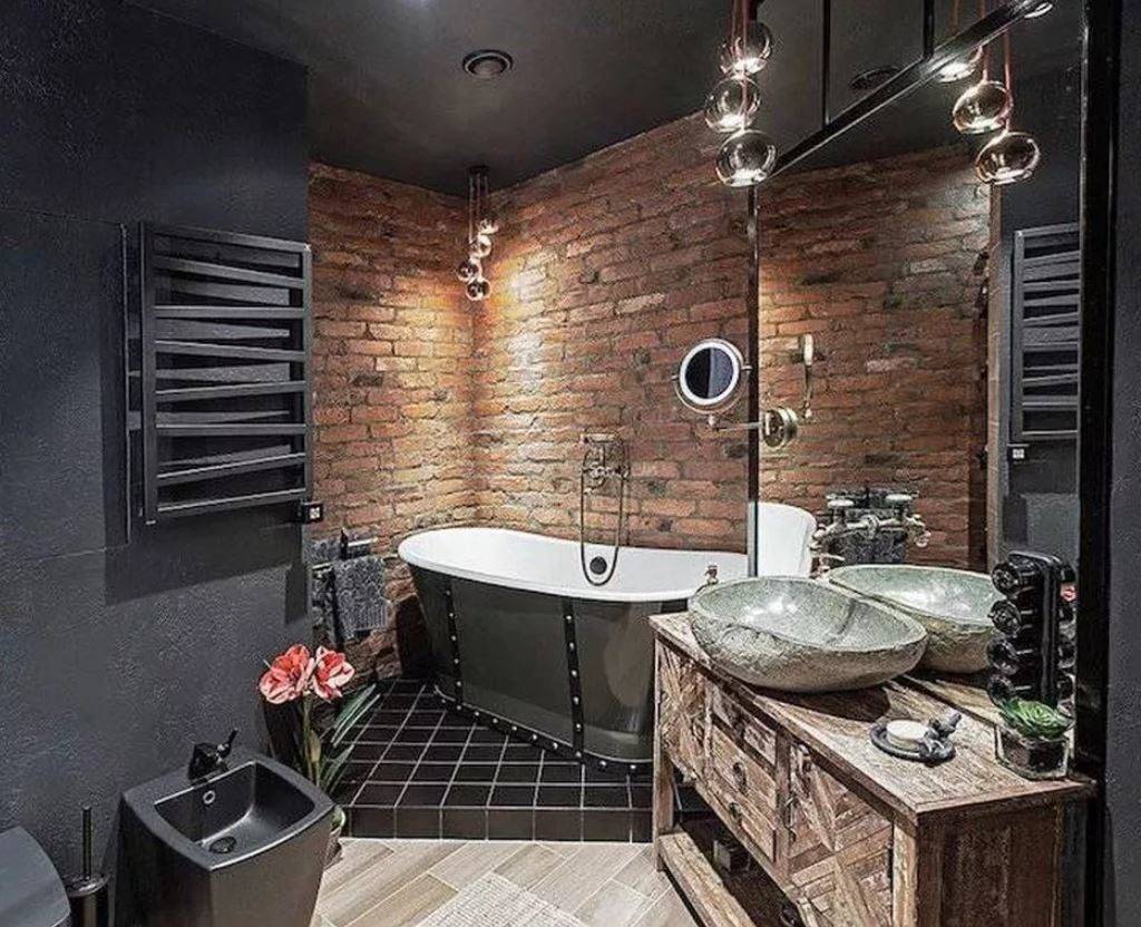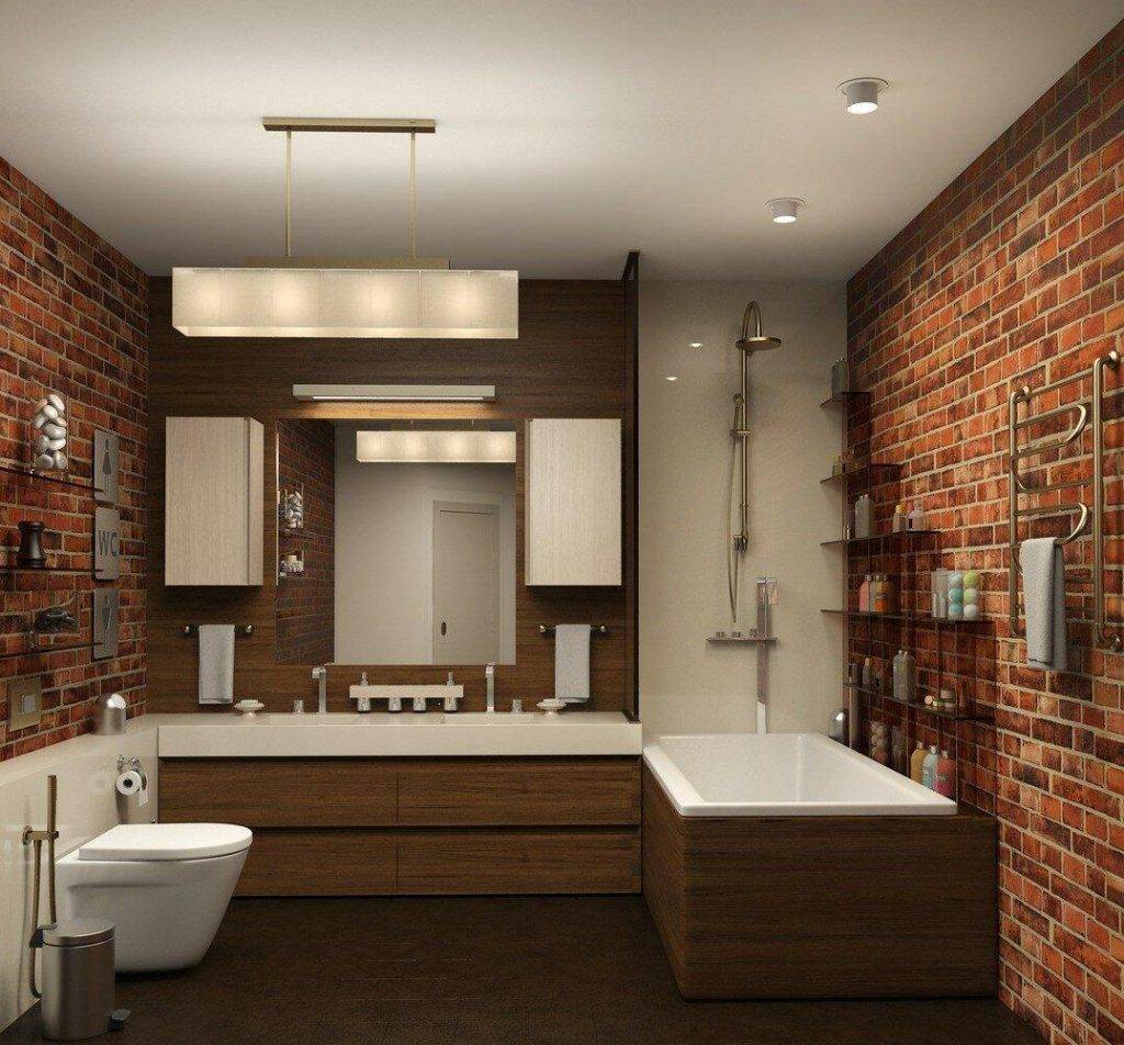 Лофта. В ванной комнате для оформления противоположной ко входу стене используется имитация кирпича. Стильным дополнением к кирпичной кладке является нержавейка, бетон;