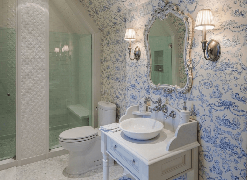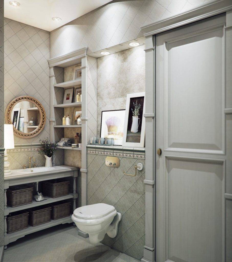 Французского прованса, предполагающего оформление интерьера в пастельных оттенков. Для украшения ванной комнаты может использоваться кованый декор, стильная фурнитура, нестандартная мебель. Пол и стены чаще всего облицовывают плиткой;