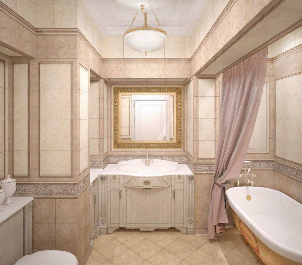 Классического стиля, допускающего использование мозаики, барельефов, вензелей с характерным золотым оформлением. Если в ванной комнате имеется окно, стекло заменяется витражом;