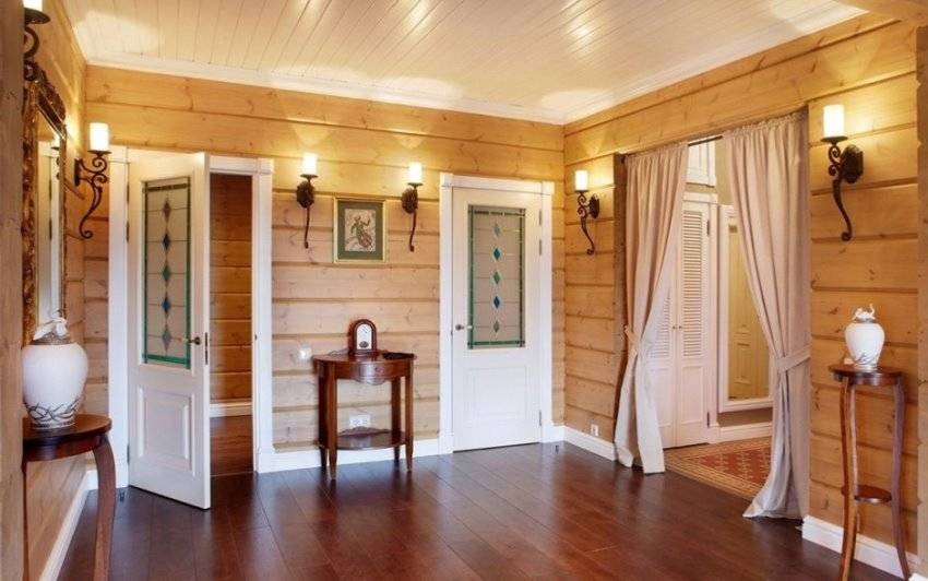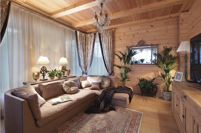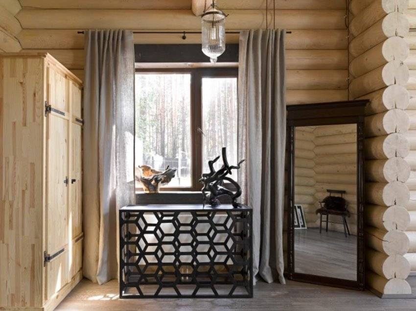- Классическому стилю интерьера в бревенчатом доме будут соответствовать тяжелые портьеры из бархата. Они отлично подходят для дачного дома, так как спасают от сквозняков и проникновения мусора.