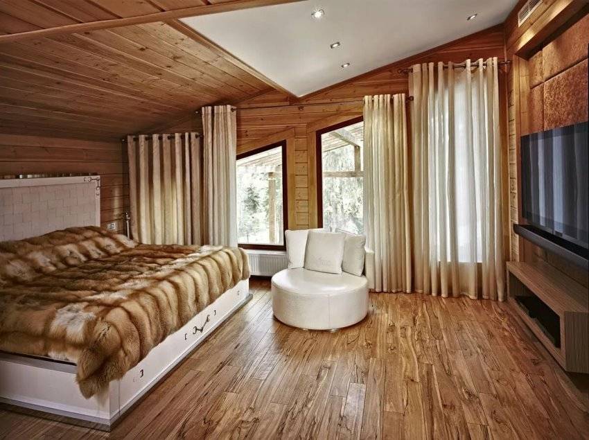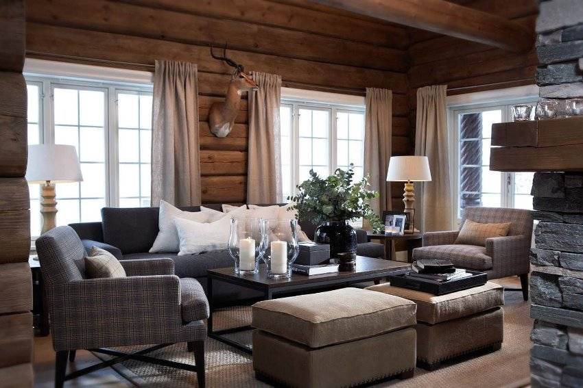 - Светлые шторы в интерьере альпийского шале