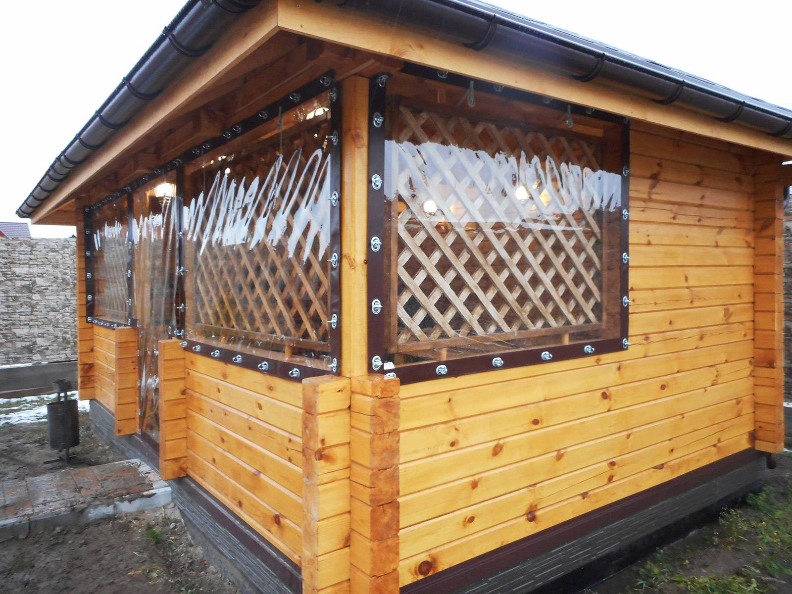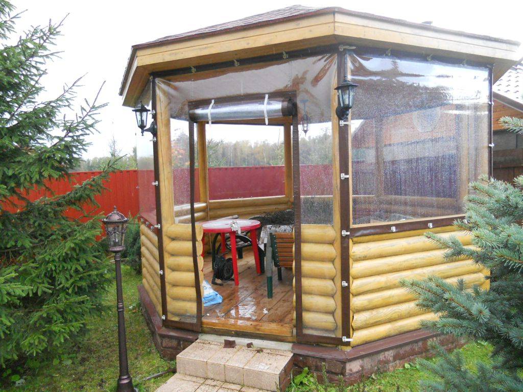 Шторы для беседки из ПВХ могут сохранять тепло внутри. Купив такие шторы, в беседку можно поставить камин или печь и не бояться, что они испортятся, ведь эти шторы выдерживают температуру свыше 50 градусов.