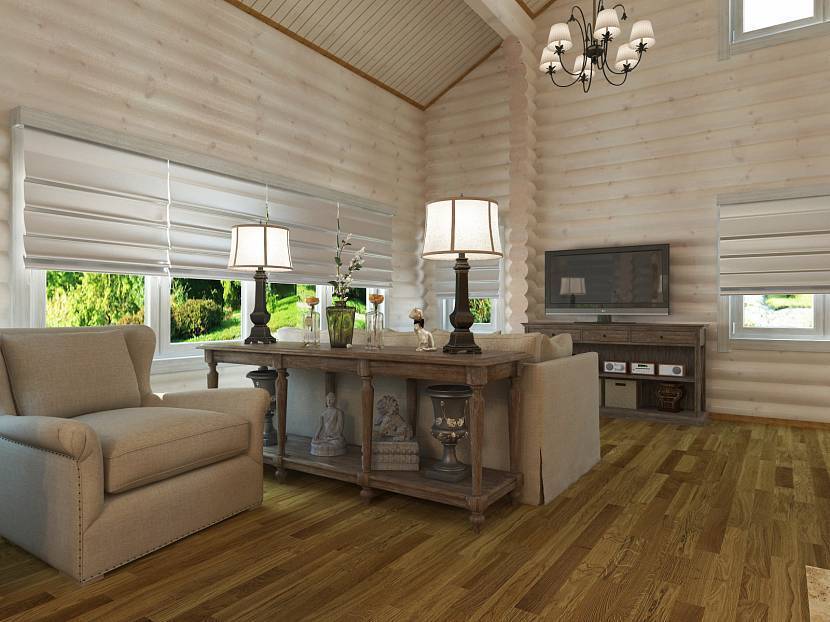 Жилое пространство, выполненное в соответствии со стилем деревянного дома, способно создать красоту деревенского колорита. Такой дизайн свидетельствует о тесной связи с народными традициями и выглядит довольно изысканно.