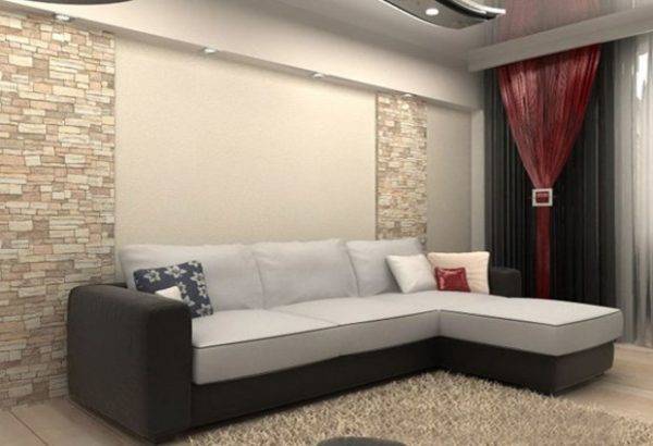 Неотъемлемый атрибут любого зала – это диван. Как показывают фото зала 18 кв. м, в небольшой гостиной лучше всего будет смотреться угловая модель. Она значительно сэкономит место.
