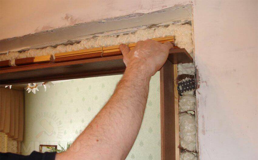 Для этого ее дополнительно обрабатывают рубанком. Завести верхнюю доску в четверть. Нивелиром и клиньями провести выравнивание по горизонтали. Далее зафиксировать к коробу и стене при помощи строительного скотча. Поставить боковые доски. Их фиксируют в проеме клиньями и распорками. Зазоры запениваются. Удалить лишнюю часть пены с дверного проема. Установить наличники.