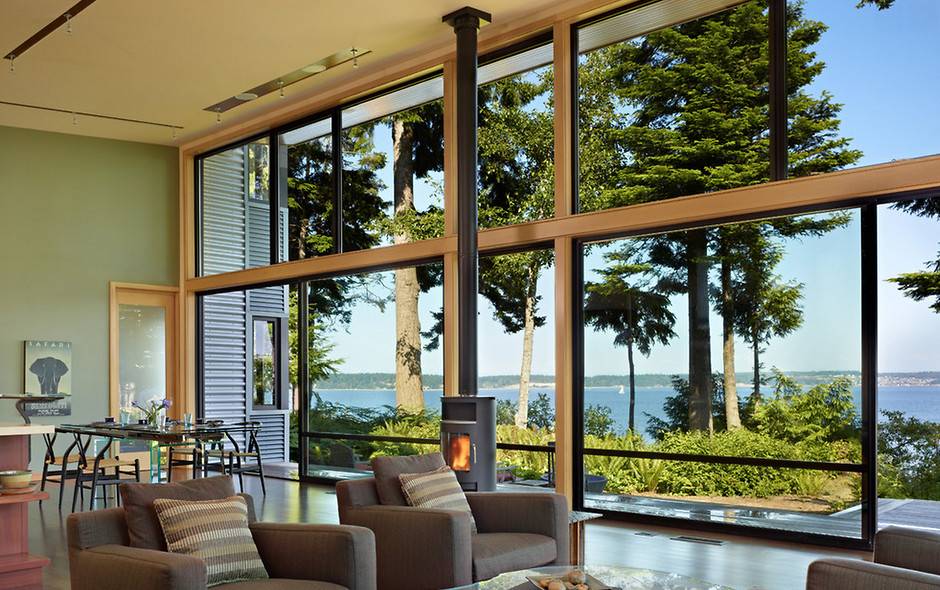 Дом с панорамными окнами может иметь окна с различным типом открывания: