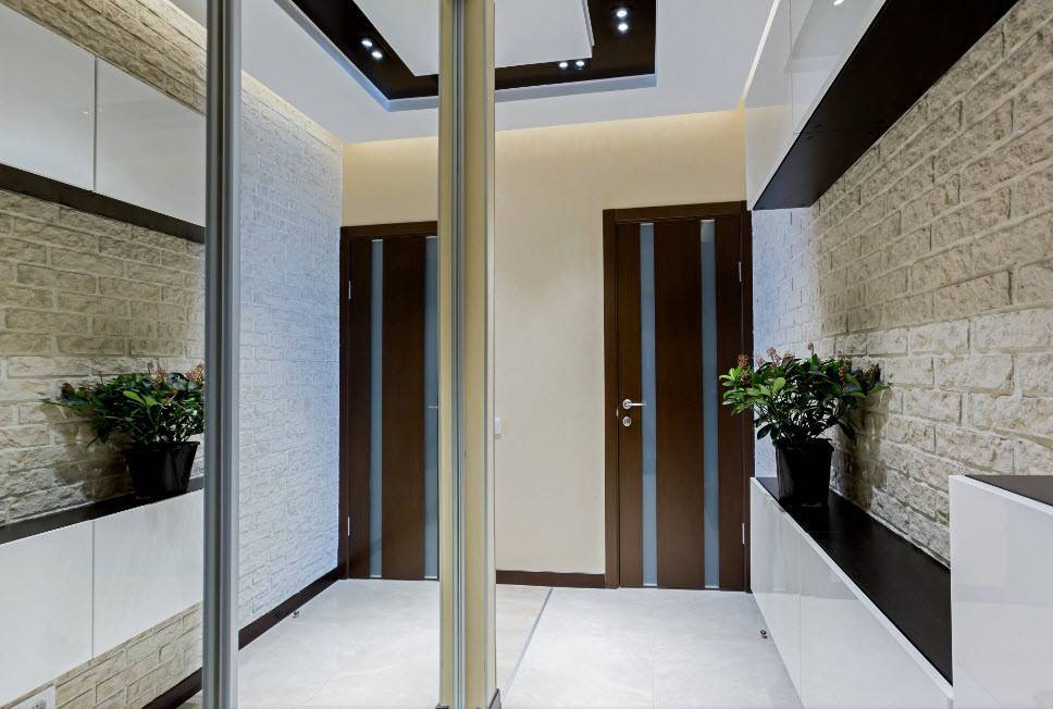 Для основного фона стен используются серые, коричневые, белые, черные оттенки. Что касается отделочных материалов, для стен используются обои, краска, штукатурка. Обои рекомендуется выбирать без орнаментов и рельефной текстуры. Хорошим выбором станут нетканые материалы цвета металлик.