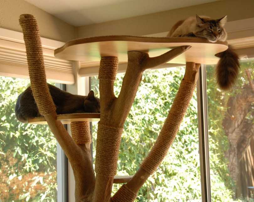 За основу кошачьего комплекса допустимо взять ствол дерева, но при этом не нужно удалять ветки полностью, оставив их часть для того, чтобы закрепить на них площадки, домик и другие элементы. Для этого берется ствол дерева, высотой около 2-х метров, после чего ветки отрезаются так, чтобы осталось сантиметров 20-30. После этого со ствола удаляется кора. Такой комплекс для животных будет особенно интересным, поскольку отличается природной основой, но при этом не нужно забывать, что его нужно хорошо укрепить.
