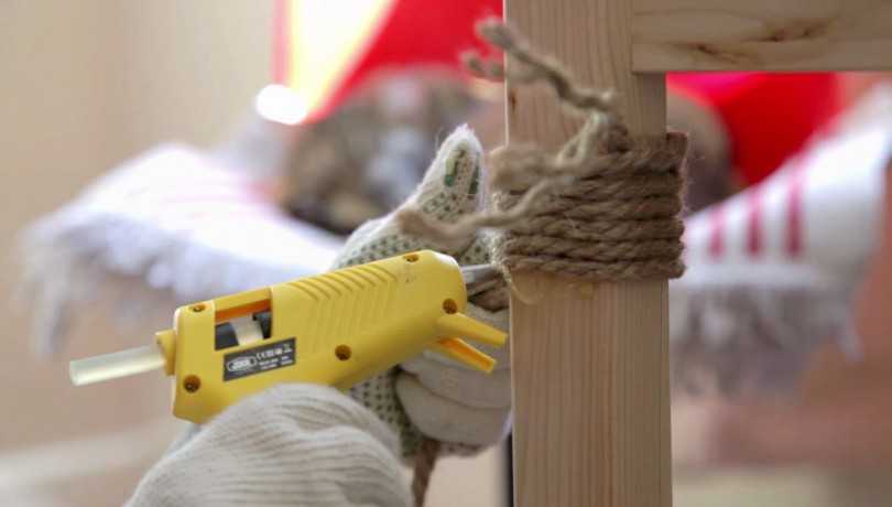 Прикрепляются трубы когтеточки и смотровой площадки. В основание наносится клей из термопистолета. На клей крепится конец веревки. Проклеивается несколько витков, которые наматываются плотно по трубе до ее середины. В середине трубы необходимо нанести несколько капель клея. Дальше идет намотка до конца трубы. После ее окончательного крепления нужно намотать еще несколько витков веревки для скрытия металла. В основание когтеточки можно установить дополнительный деревянный кружок. Он только укрепит конструкцию. Его тоже обматывают веревкой, которую крепят с помощью клея и скоб.