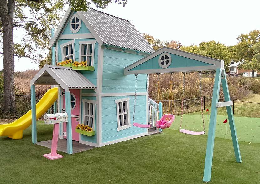 Конструкция может быть простой. Как вариант, можно обустроить двухэтажный дом для детей с горками и башнями.