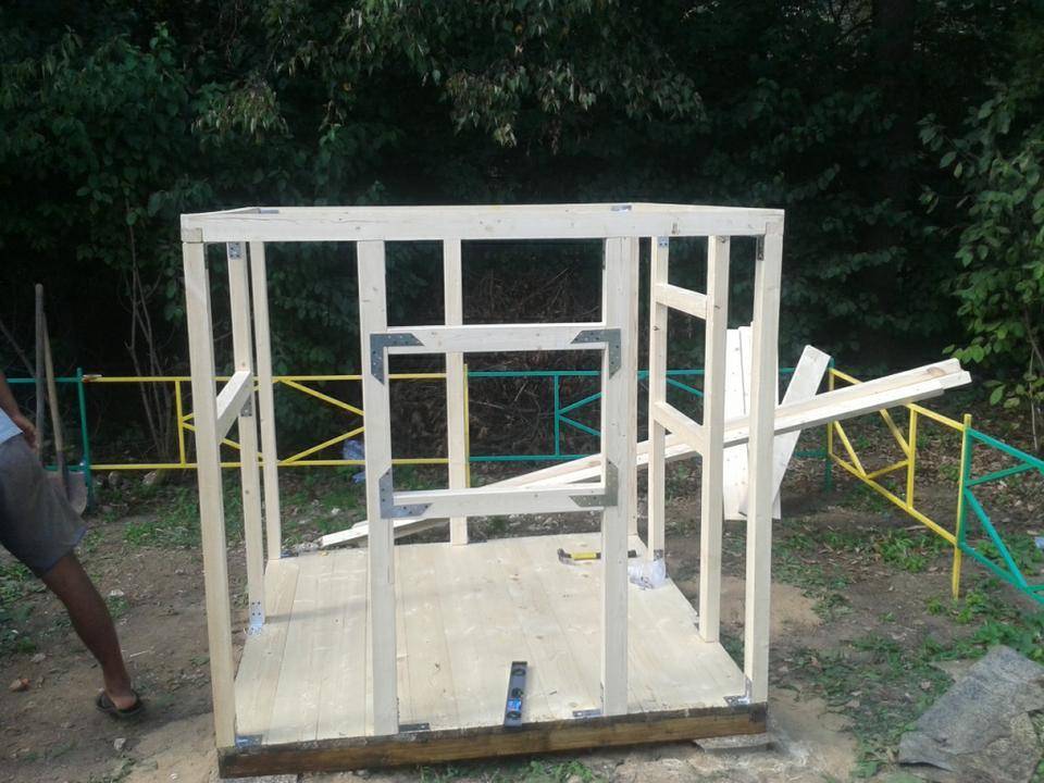 Маленький домик для двевочки Для начала собираем каркас из брусьев согласно чертежам. Далее оббиваем полученный каркас досками. Важная деталь: минимальная толщина досок составляет 2 см. Более тонкие варианты дадут слишком шаткую и небезопасную конструкцию.