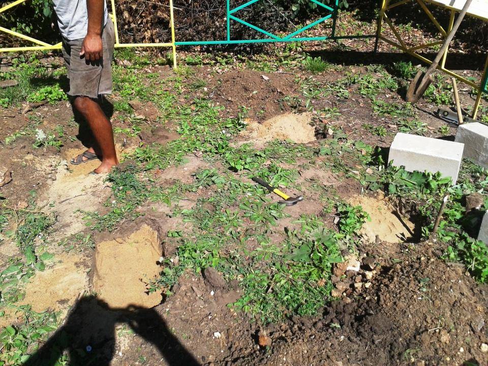 Выбираем ровное место для домика и с помощью каркаса отмечаем 4 угловые точки, необходимые для импровизированного фундамента.