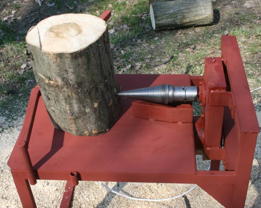 - Конусный тип. Распилка дров производится конусом с резьбой, который в процессе вращения врезается в бревно, разделяя его на части. Так же как и реечный дровокол, его достаточно просто сделать самостоятельно. Единственным нюансом является необходимость в более мощном двигателе.