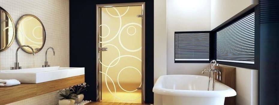 Дизайн стеклянных дверей очень разнообразен. В ванную комнату принято устанавливать глухие конструкции, поэтому вопрос с прозрачностью стекла дизайнеры решают различными способами: создают витражные рисунки, делают напыление красками, оклеивают пленкой или матируют.