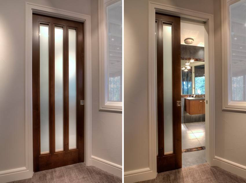 Основным преимуществом сдвижных дверей является экономия пространства, особенно в маленьких квартирах. Но все же это не самый лучший вариант дверей в санузел. Минусом такой системы является наличие щели между полом и полотном, что отрицательно сказывается на тепло- и звукоизоляции. Если все-таки необходимо установить именно такую конструкцию, то наиболее выгодным будет вариант сдвижных кассетных дверей. Они при открывании задвигаются в стену. Недостатки такой конструкции минимальны, но, если дверь заклинит, есть вероятность того, что придется разбирать стену.